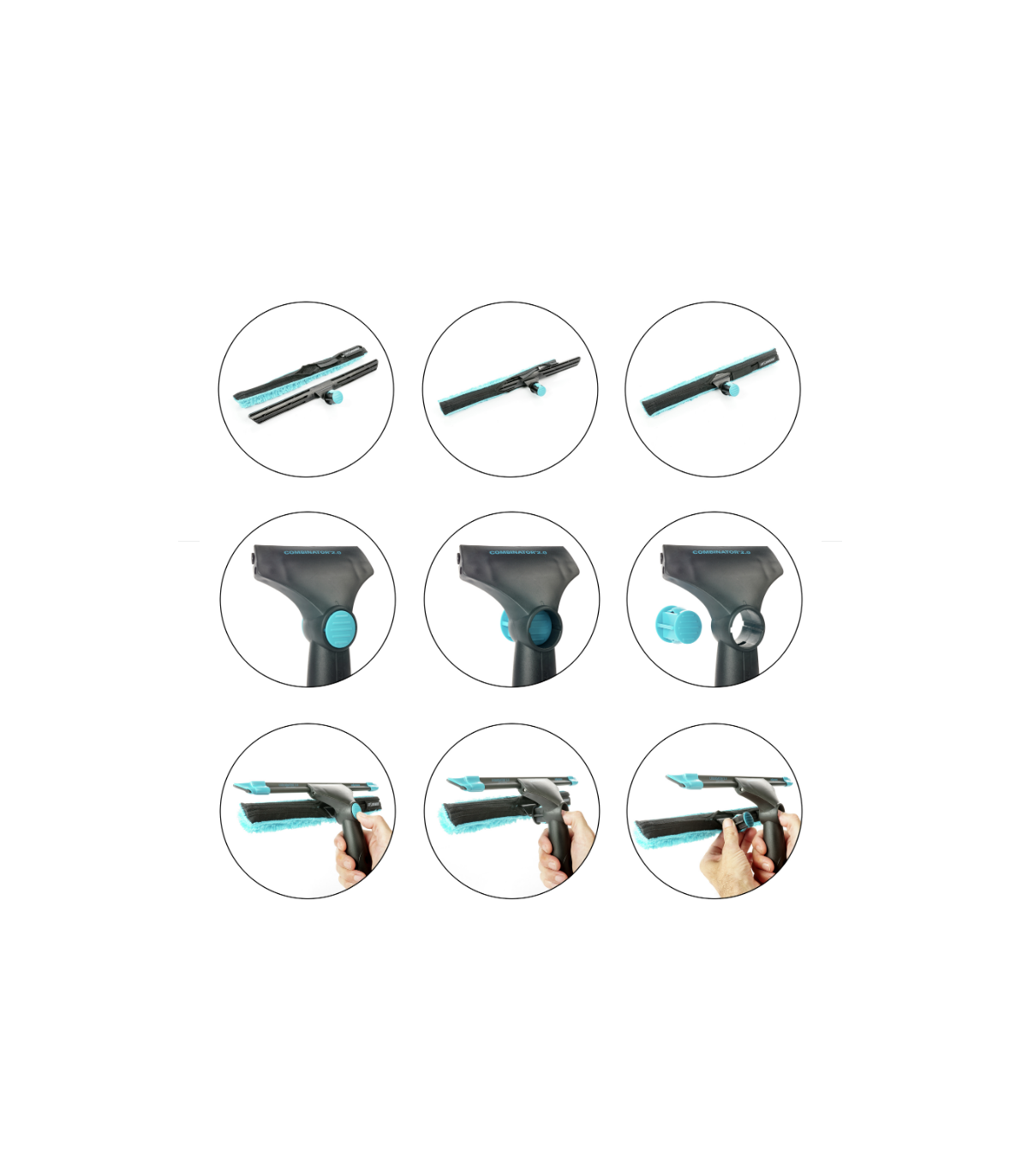 Zestaw przeznaczony do szybkiego rozprowadzania chemii, czyszczenia oraz zbierania zanieczyszczeń bez zmiany osprzętu. Specjalnie zaprojektowana listwa z miękką gumą pozwala na dokładne zbieranie wody z całej powierzchni włącznie z bokami oraz rogami okien bez pozostawiania smug oraz zacieków. Baranek na dołączonym stelażu wedle preferencji możemy zamontować z przodu lub z tyłu listwy.