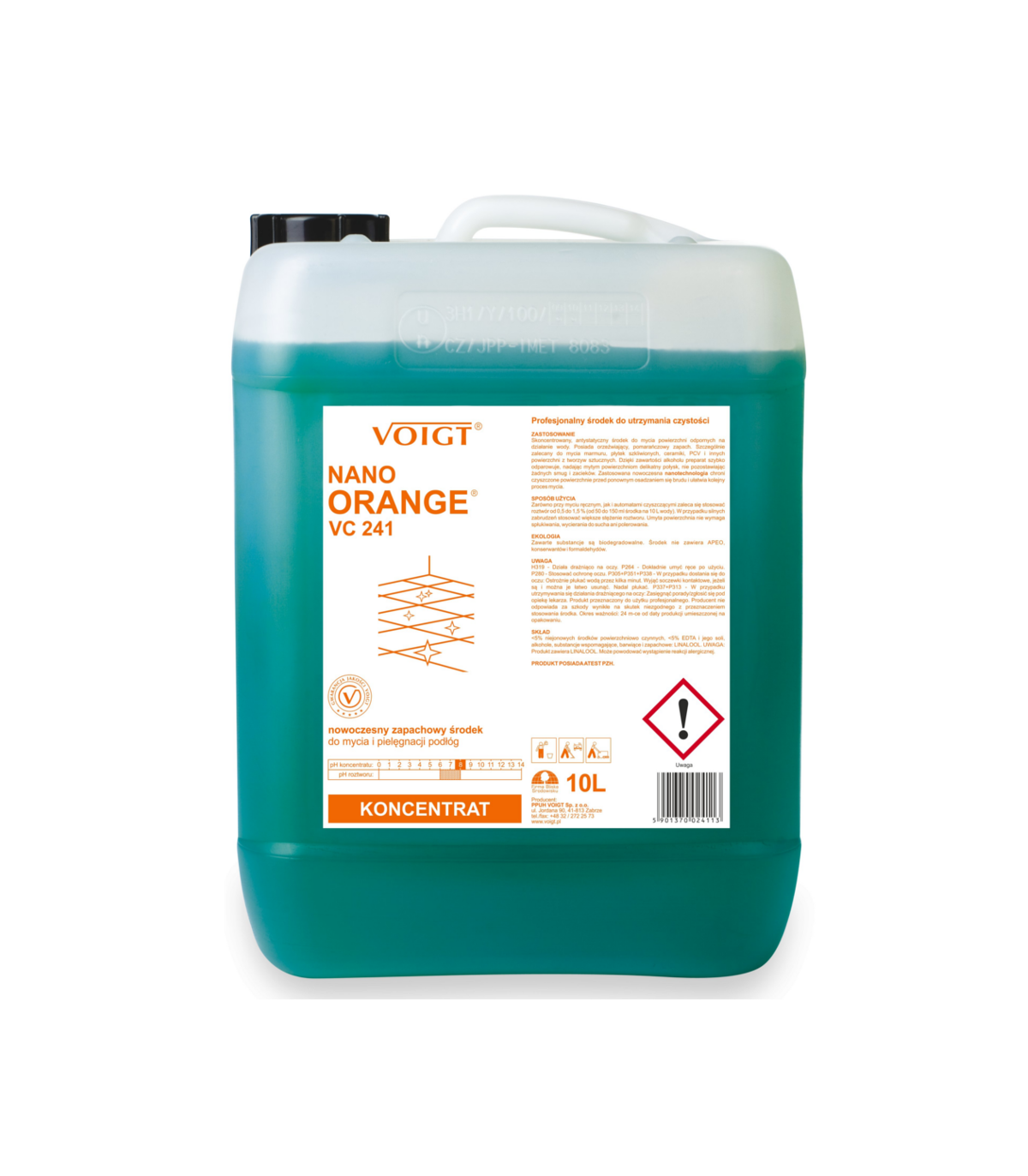 VC 241 NANO ORANGE renomowanej marki VOIGT to jeden z najpopularniejszych profesjonalnych środków myjących do podłóg w Polsce. Swoją pozycje na rynku zawdzięcza przede wszystkim bardzo dobrym właściwościom myjącym, wydajnością oraz długotrwałym przyjemnym zapachu pomarańczy. Dzięki właściwością antystatycznym oraz zastosowanej technologi nanocząsteczek krzemu preparat szczególnie dobrze sprawdzi się na wszystkich powierzchniach szkliwionych, takich jak płytki ścienne i podłogowe, podłogi kamienne czy ceramika. Produkt szybko wysycha, nie zostawia smug oraz zacieków. Na mytych powierzchniach pozostawia cienką warstwę zabezpieczającą przed szybkim odkładaniem się brudu i kurzu, delikatnie nabłyszcza.