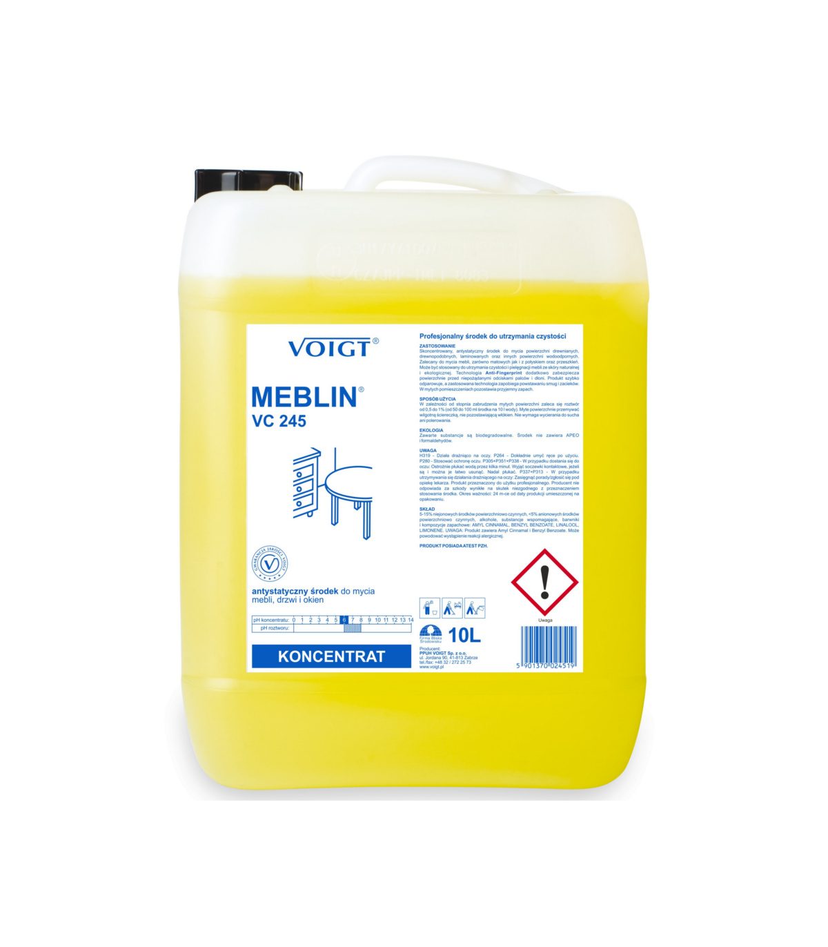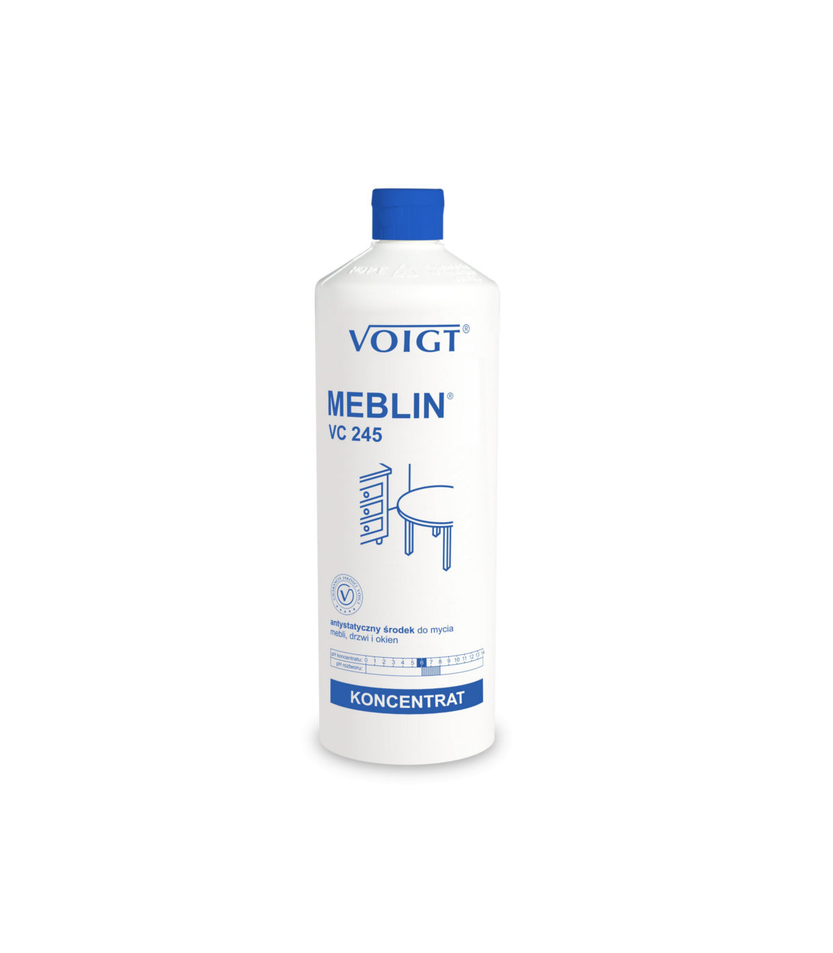 VC 245 MEBLIN marki VOIGT to skuteczny preparat do mycia oraz pielęgnacji mebli i laminatów. W szczególności polecany do bieżącego utrzymania czystości mebli, zarówno matowych jak i z połyskiem, powierzchni i wyposażenia wykonanych z tworzyw sztucznych i lakierowanych. MEBLIN świetnie sprawdzi się do mycia paneli, zarówno klasycznych jak i winylowych oraz lakierowanych parkietów drewnianych. Może posłużyć jako uniwersalny środek czyszczących w domu, biurach, szkołach czy przedszkolach.