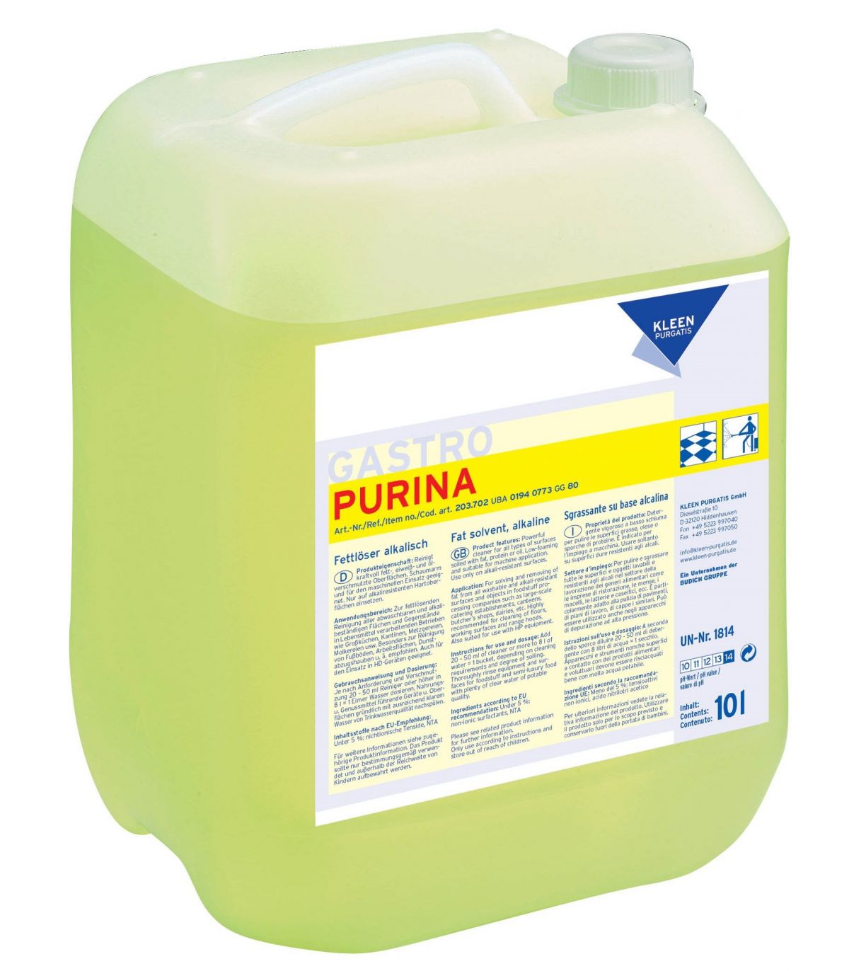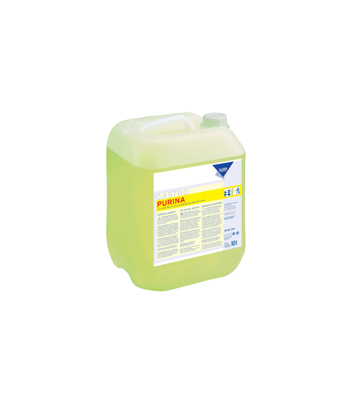 PURINA niemieckiej marki KLEEN to wysokiej jakości silnie skoncentrowany płyn do usuwania zabrudzeń olejowych, białkowych i tych pochodzenia tłuszczowego. Nadaje się do bieżącego mycia wszelkich zmywalnych powierzchni i obszarów produkcyjnych, maszyn, urządzeń oraz pomieszczeń gastronomicznych odpornych na działanie alkaliów.
