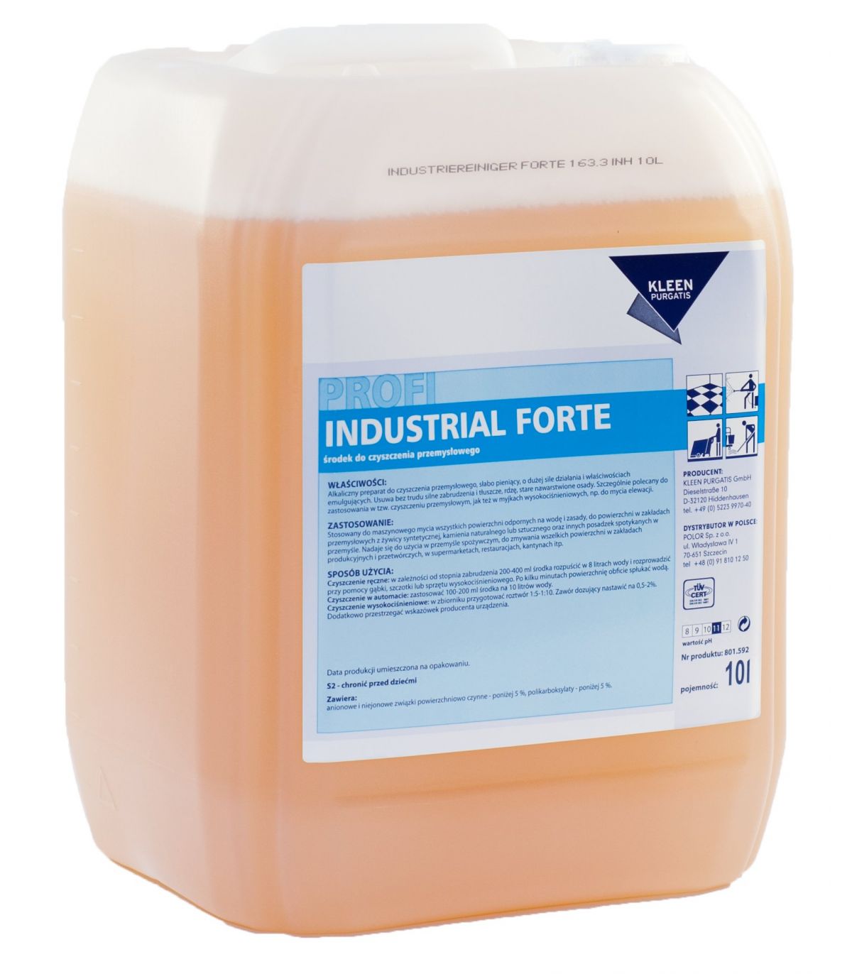 INDUSTRIAL FORTE niemieckiej marki KLEEN to ekonomiczny i wydajny zasadowy środek do czyszczenia i bieżącego mycia powierzchni przemysłowych. Idealny do zastosowania w zakładach produkcyjnych i przetwórczych, a także w magazynach, supermarketach, galeriach handlowych, garażach oraz parkingach.