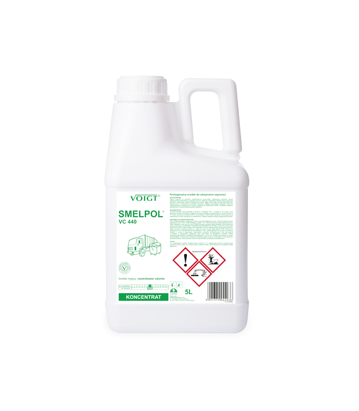 VC440 SMELPOL marki VOIGT to skoncentrowany, antybakteryjny preparat rozkładający szkodliwe związki siarkowodorowe, zachodzące w procesach gnilnych. Eliminuje nieprzyjemne zapachy (odory), pozostawiając cytrusowy zapach. Rozpuszcza tłuszcze, oleje, woski, białka. Usuwa farby drukarskie. Zalecany do stosowania w kuchniach, rzeźniach, hotelach, restauracjach, kantynach. Może być wykorzystywany w oczyszczalniach ścieków, wysypiskach, składowiskach śmieci, śmietnikach, toaletach stacjonarnych. Preparat eliminuje zapachy spalenizny.