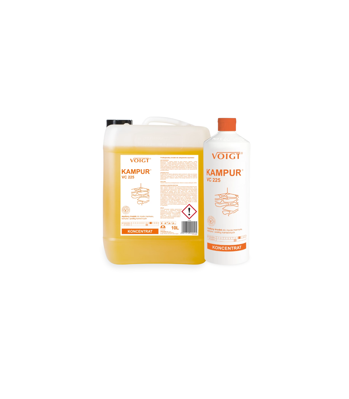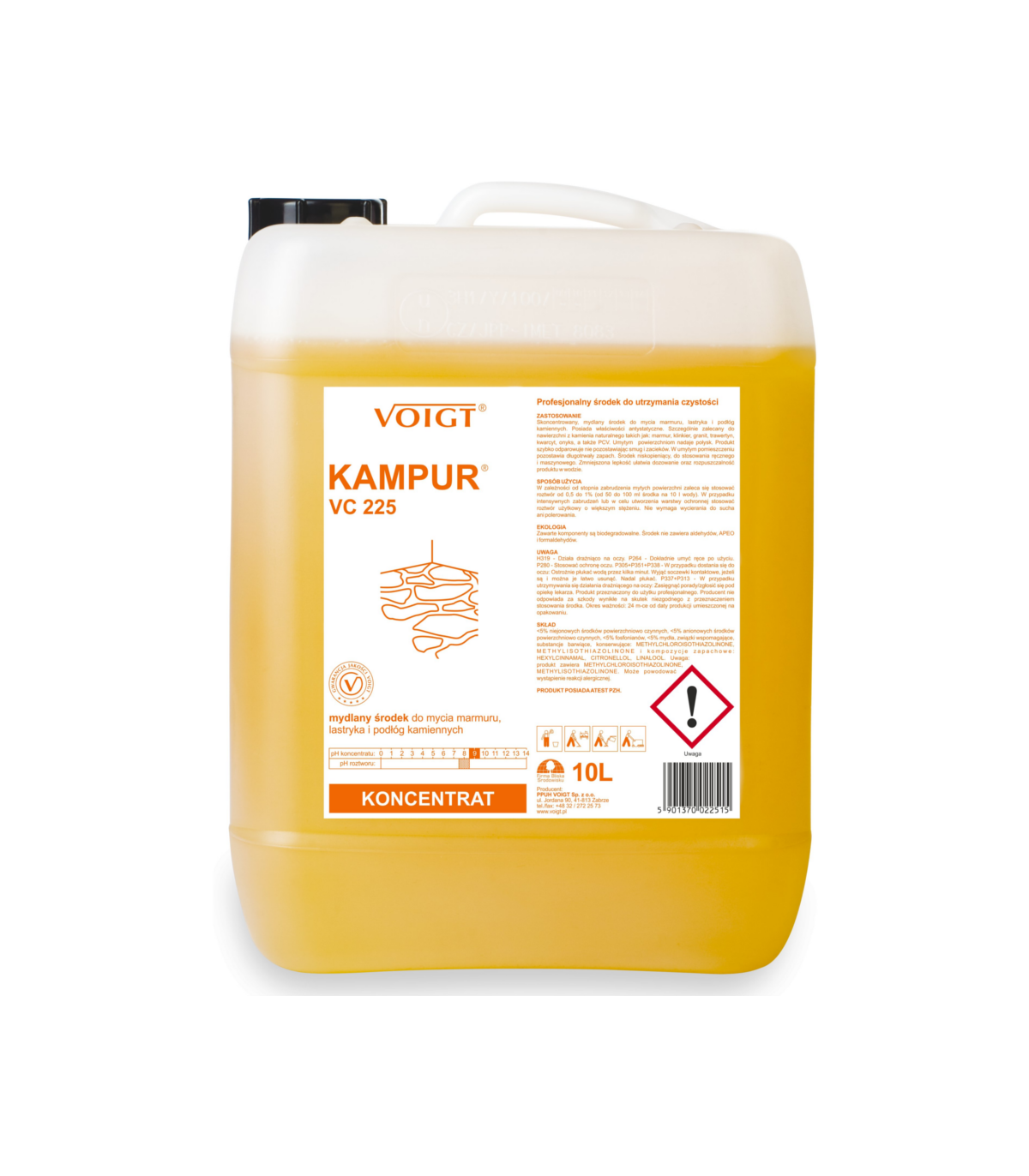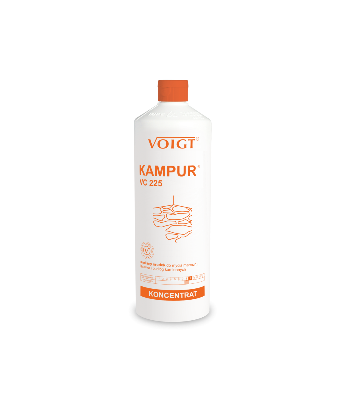 VC225 KAMPUR marki VOIGT to skoncentrowany, mydlany środek do mycia marmuru, lastryka i podłóg kamiennych. Posiada właściwości antystatyczne i pielęgnujące. Szczególnie zalecany do powierzchni z kamienia naturalnego takich jak: marmur, klinkier, granit, trawertyn, kwarcyt, onyks, a także wykładzin PCV. Skutecznie czyści nie pozostawiając smug oraz zacieków, nadając powierzchni naturalny połysk.