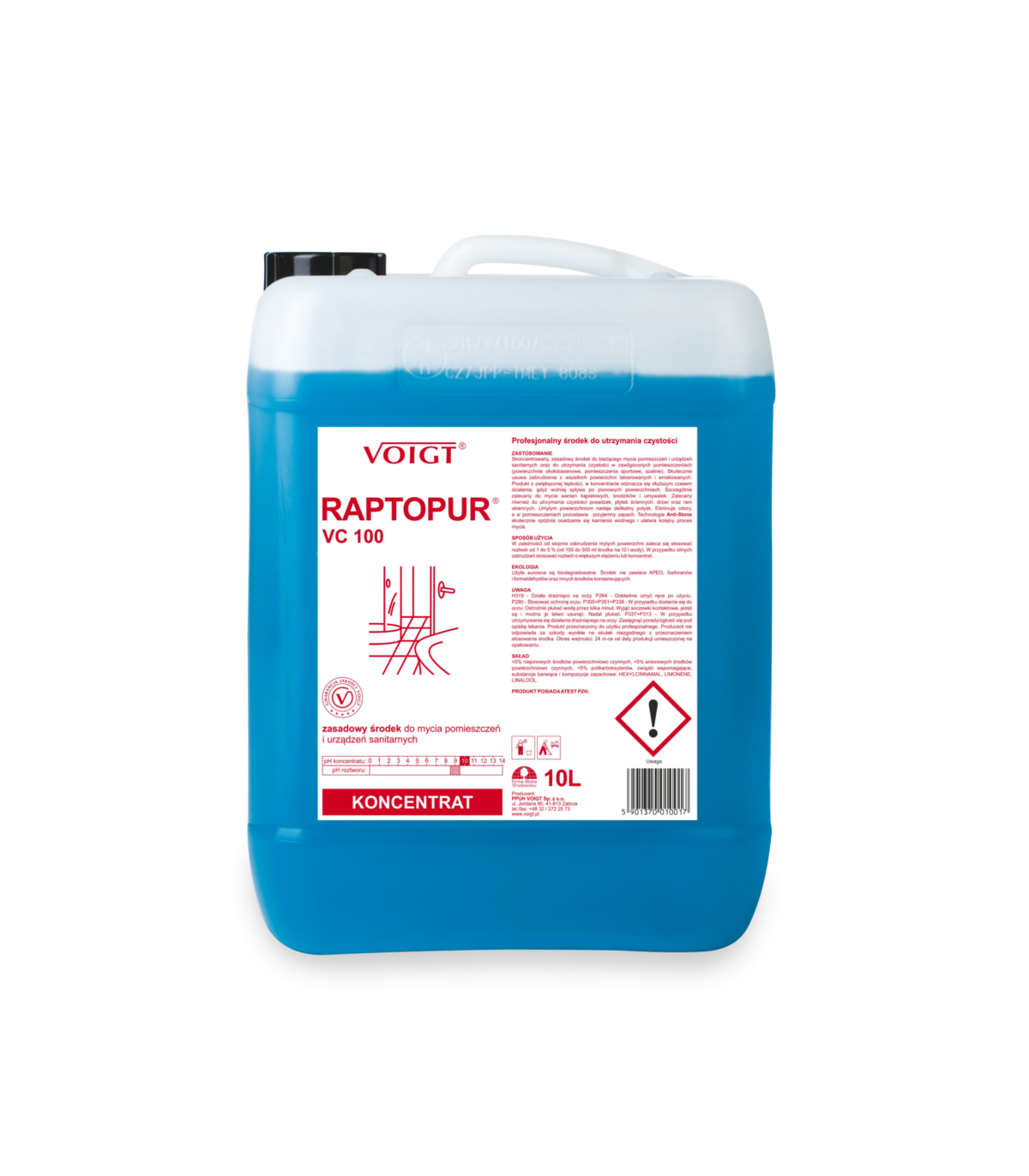 VC100 RAPTOPUR marki VOIGT to skoncentrowany, zasadowy środek do bieżącego mycia pomieszczeń i urządzeń sanitarnych oraz do utrzymania czystości w zawilgoconych pomieszczeniach. Zalecany do mycia powierzchni okołobasenowych, szatni, natrysków czy pomieszczeń sportowych. Usuwa bieżące zabrudzenia, mydła oraz tłuszcze.