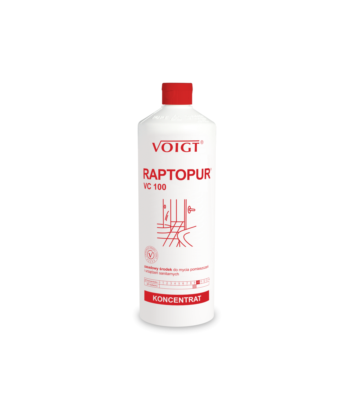 VOIGT VC 100 RAPTOPUR to skoncentrowany, zasadowy środek do bieżącego mycia pomieszczeń i urządzeń sanitarnych oraz do utrzymania czystości w zawilgoconych pomieszczeniach (powierzchnie okołobasenowe, pomieszczenia sportowe, szatnie oraz sauny). Zalecany do bieżącego utrzymania czystości posadzek, płytek ściennych, drzwi, ram okiennych oraz mycia wanien kąpielowych, brodzików i umywalek.  Produkt na zamówie