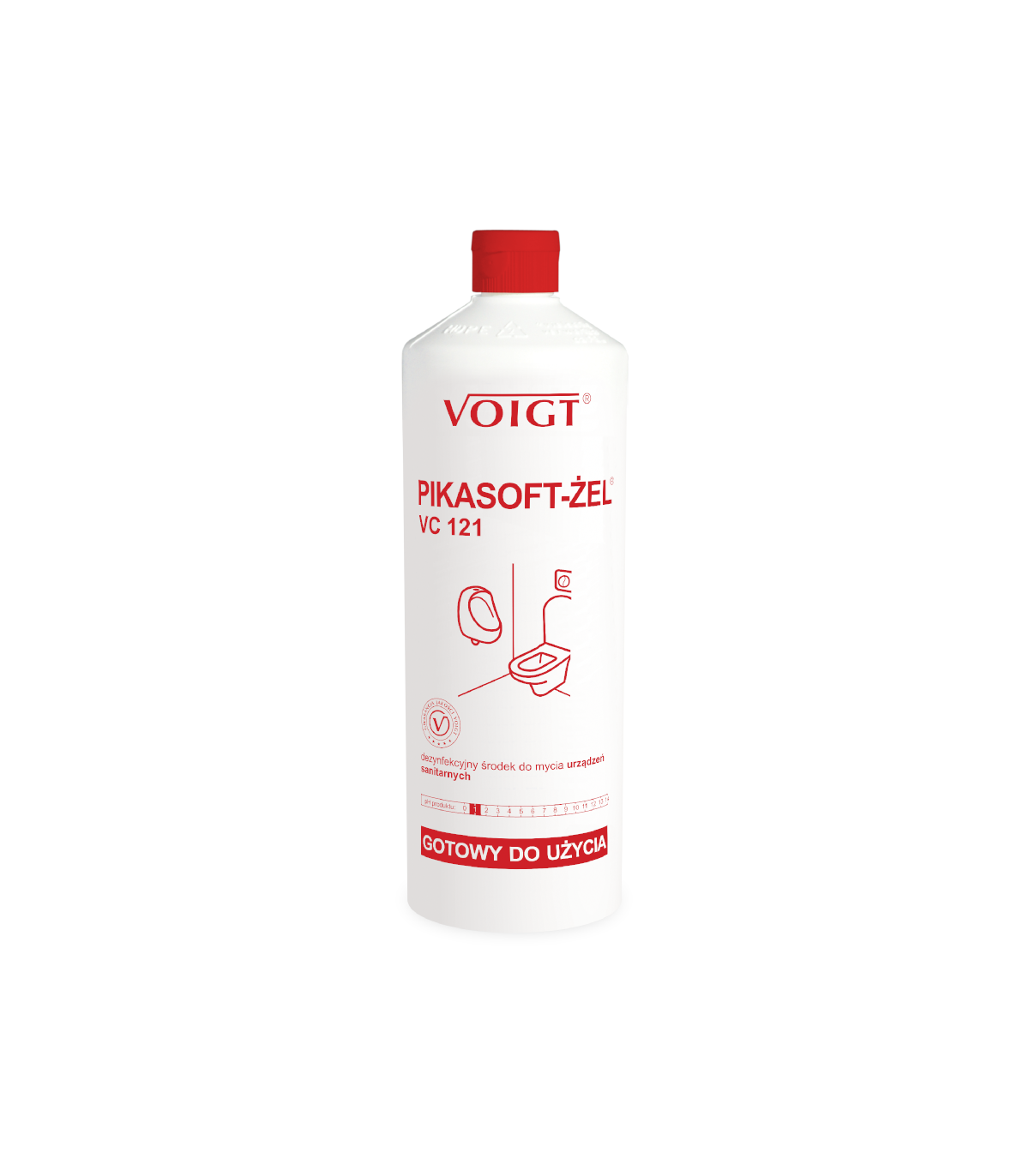 VC121 PIKASOFT-ŻEL marki VOIGT to skuteczny, kwasowy preparat w formie żelu przeznaczony do usuwania osadów pochodzenia wapiennego, mydeł, kamienia oraz rdzy z powierzchni sanitarnych. Posiada właściwości dezynfekujące o grzybobójczym i bakteriobójczym spektrum działania. W szczególności polecany do czyszczenia powierzchni ukośnych i pionowych takich jak muszle klozetowe, pisuary czy wanny.