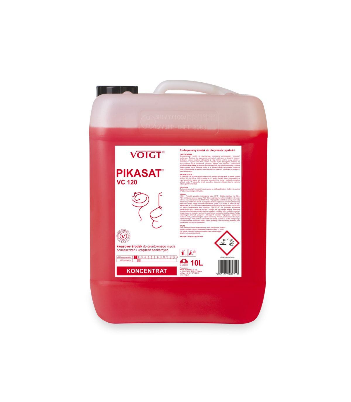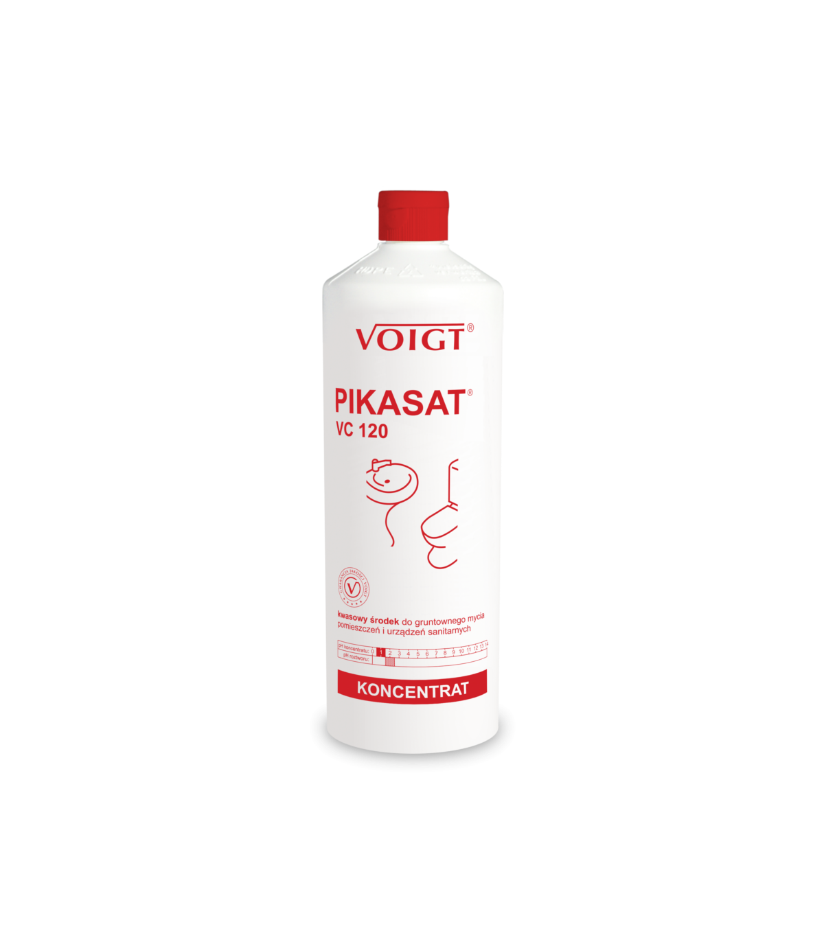 VC120 PIKASAT marki VOIGT to bardzo silny i skuteczny środek przeznaczony do okresowego mycia lub gruntownego doczyszczania pomieszczeń i wyposażenia sanitarnego odpornego na działanie silnych kwasów. Do usuwania nawarstwionych osadów z kamienia wodnego, moczu, rdzy, mydeł oraz osadów wapiennych i cementowych z płytek ściennych i podłogowych, fug, wanien, kabin prysznicowych, brodzików, pisuarów, umywalek czy sedesów.