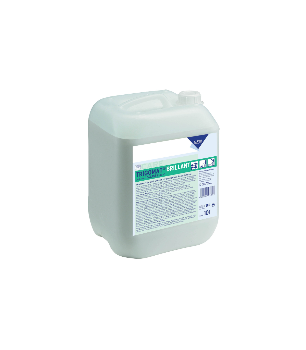 TRIGOMAT BRILLANT niemieckiej marki KLEEN to najwyższej jakości nowoczesny, antypoślizgowy, elastyczny polimer do powlekania i zabezpieczania podłóg. Polimer nie żółknie, nie zmienia koloru podłoża i jest wysoce odporny na ścieranie oraz działanie środków dezynfekujących. Spełnia standardy normy ASTM D2047--044 w zakresie tarcia statycznego. Zalecany do użycia na powierzchniach często uczęszczanych o wysokim natężeniu ruchu. Finish o trwałym połysku z efektem "rozlanej wody".