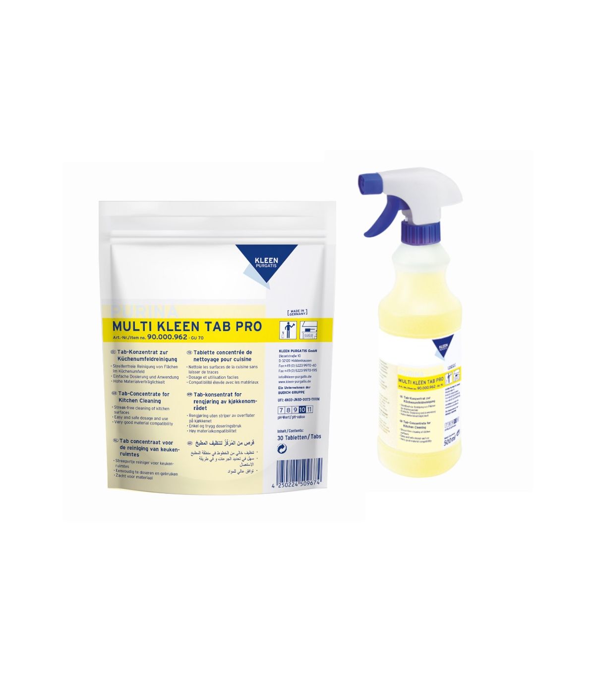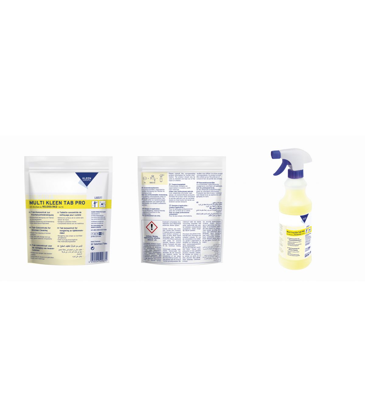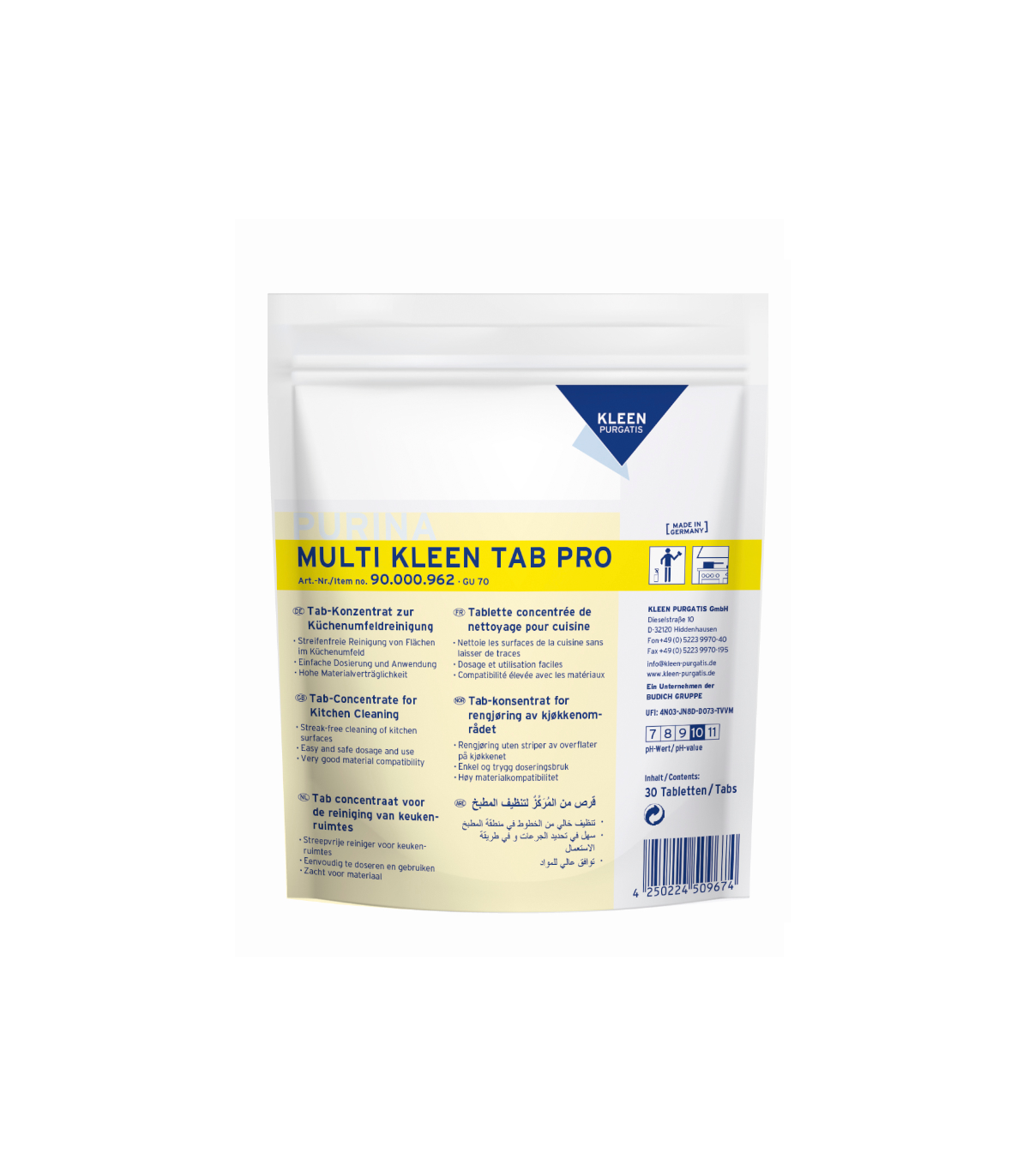 PURINA Multi Kleen Tab Pro marki KLEEN PURGATIS w formie tabletek to środek służący do bezsmugowego czyszczenia i odtłuszczania obszarów gastronomicznych, czyszczenia wyposażenia i powierzchni kuchennych. Wygodne i proste dozowanie. Opakowanie 30 tabletek pozwala na przygotowanie trzydziestu porcji gotowego roztworu o pojemności 500ml.
