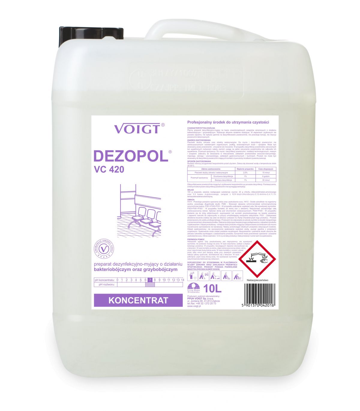 H314: Powoduje poważne oparzenia skóry oraz uszkodzenia oczu. H412: Działa szkodliwie na organizmy wodne, powodując długotrwałe skutki. P280: Stosować rękawice ochronne/odzież ochronną/ochronę oczu/ochronę twarzy. P301+P330+P331: W przypadku połknięcia: wypłukać usta. Nie wywoływać wymiotów. P303+P361+P353: W przypadku kontaktu ze skórą (lub z włosami): natychmiast zdjąć całą zanieczyszczoną odzież. Spłukać skórę pod strumieniem wody/prysznicem. P304+P340: W przypadku dostania się do dróg oddechowych: wyprowadzić lub wynieść poszkodowanego na świeże powietrze i zapewnić mu warunki do swobodnego oddychania. P321: Zastosować określone leczenie (należy się udać do lekarza i pokazać mu Kartę Charakterystyki tego produktu). Produkt przeznaczony do użytku profesjonalnego. Producent nie odpowiada za szkody wynikłe na skutek niezgodnego z przeznaczeniem stosowania środka. Zalecenia dotyczące bezpiecznego postępowania z odpadami produktu i opakowaniem: Odpad produktowy - mniejsze ilości zdeponowane mogą być razem z domowymi śmieciami lub mocno rozcieńczone wprowadzone do kanalizacji. Należy przestrzegać lokalnych przepisów dotyczących ścieków. Odpad opakowaniowy - nie wyczyszczone opakowanie wypłukać wodą, usunąć zgodnie z przepisami dotyczącymi utylizacji odpadów opakowaniowych. Opakowanie może zostać poddane recyklingowi. Bezpośrednie i pośrednie skutki uboczne dla zdrowia człowieka wynikające z zastosowania produktu: koncentrat może powodować oparzenia i poważne uszkodzenie oczu. Okres ważności: 12 m-cy od daty produkcji. Data produkcji i numer serii na opakowaniu.