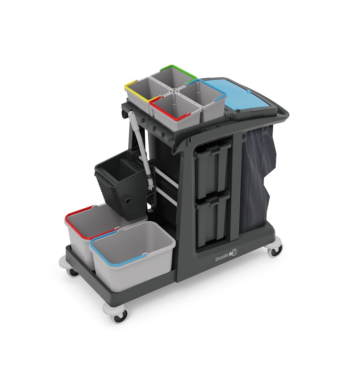Model ECO-MATIC EM 5 został wyposażony w dwa duże 17 litrowe wiadra na brudną i czystą wodę pracujące razem z dobrze już znaną, oryginalną i uniwersalną wyciskarką doczołową Numatic. Możliwość wygodnej pracy i dokładnego odciskania zarówno mopów sznurkowych, mopów typu "Kentucky" jak i klasycznych mopów płaskich. Bogate wyposażenie dodatkowe w postaci dwóch dużych wysuwanych kuwet oraz czterech mniejszych górnych wiaderek pozwala na wygodne przewożenie dodatkowego wyposażenia i akcesoriów do sprzątania. Zestaw wyposażony w duży stelaż na worek 120L lub 2x70L. Całość konstrukcji osadzono na kompaktowej i zwrotnej, nieco ponad metrowej platformie z czterema wytrzymałymi kołami o średnicy 100mm.