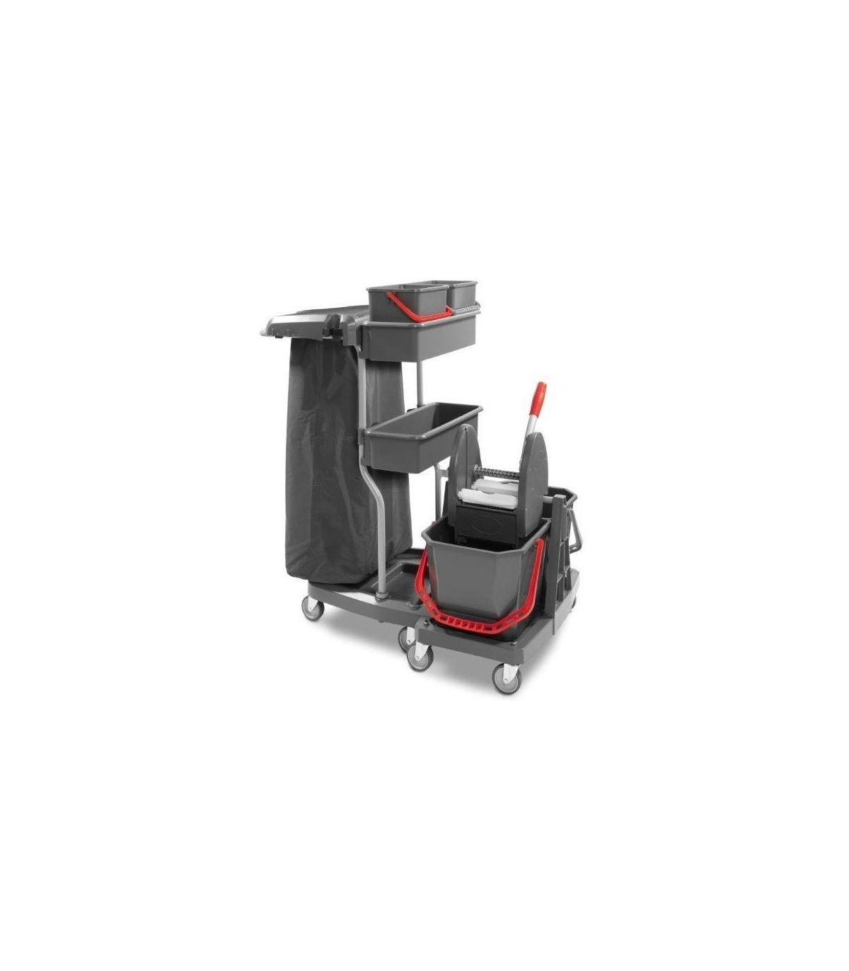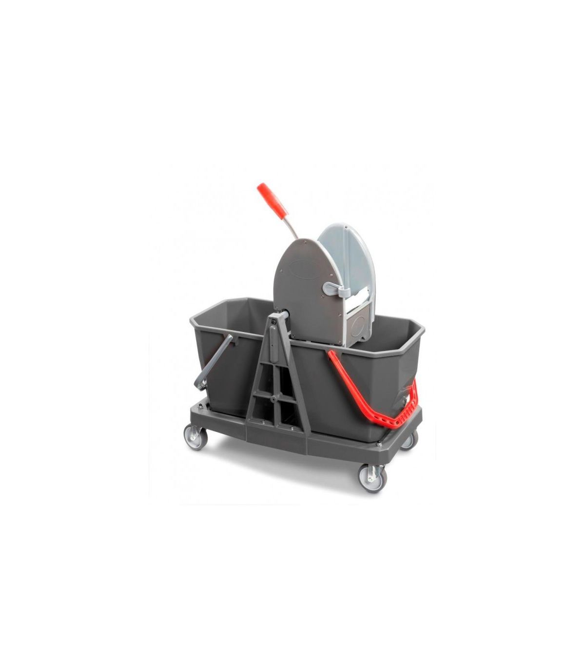 Profesjonalny modułowy wózek serwisowy wyposażony w kompletny wózek z wyciskarką, dwie duże kuwety, dwa mniejsze 6 litrowe wiaderka oraz uchwyt na worek 120L z pokrywą. Możliwość łatwego i szybkiego montażu i demontażu modułów. Osobne podstawy z kółkami dają możliwość osobnej pracy wózka sprzątającego oraz stelaża na worek i akcesoria. Solidna konstrukcja z wytrzymałego tworzywa sztucznego wysokiej jakości potwierdzona certyfikatami ISO 9001 oraz 14001. Dwa duże wiadra o pojemności 20 litrów na brudną i czystą wodą pozwalają na efektywne mycie podłóg bez konieczności częstej wymiany wody. Uniwersalna szczękowa prasa z antypoślizgowym uchwytem dołączona do wózka pozwala na dokładne odciśnięcie każdego rodzaju mopa. W porównaniu do wielu chińskich modeli, włoski producent postawił na wysokiej jakości wkręcane kółka o średnicy 80mm które gwarantują długą, cichą i bezawaryjną pracę. Zestaw sprzątający świetnie sprawdzi się do utrzymania czystości w szkołach, przedszkolach, biurach, sklepach czy placówkach służby zdrowia.
