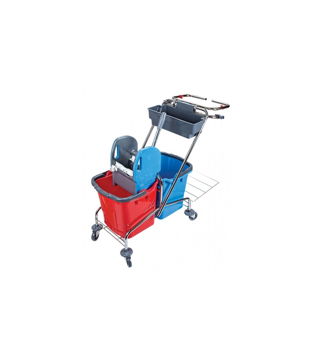 Profesjonalny wózek sprzątający wyposażony dwa oddzielne wiadra na czystą i brudną wodę. Podstawę konstrukcji wózka stanowi odporny, metalowy chromowany stelaż. Dwa duże wiadra o łącznej pojemności ponad 30 litrów pozwalają na efektywne mycie podłóg bez konieczności częstej wymiany wody. Uniwersalna szczękowa prasa z antypoślizgowym uchwytem dołączona do wózka pozwala na dokładne odciśnięcie każdego rodzaju mopa. Nierysujące gumowe i w pełni skrętne kółka z osłonkami zapewniają łatwość prowadzenia zestawu. Metalowy koszyk pozwala na wygodne przewożenie drobnego ręcznego sprzętu lub środków czystości. Konstrukcje uzupełnia w pełni demontowalny stelaż z podstawką na duży worek na śmieci o pojemności 120 litrów. Wysoka jakość wykonania i prosta konstrukcja pozwala na bezproblemową i wieloletnią eksploatacje. Zestaw sprzątający świetnie sprawdzi się do utrzymania czystości w szkołach, przedszkolach, biurach, sklepach czy placówkach służby zdrowia.
