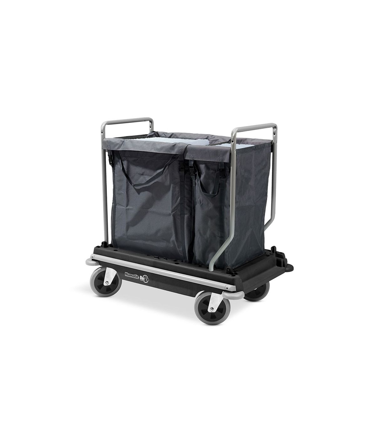 Wielofunkcyjny wózek hotelowy firmy Numatic przeznaczony do segregacji i wymiany brudnej pościeli. Zbudowany na solidnej i sztywnej platformie z tworzywa Structofoam (odpornego na pęknięcia) z czterema kołami skrętnymi dla maksymalnej zwrotności. Duże gumowane kola na łożyskach kulkowych zapewniają ciche przemieszczanie wózka. Wyposażony w dwa wyjmowalne worki brezentowe o pojemności 200 litrów oraz 100 litrów, które ułatwiają transport pościeli. Wózek można powiększyć o dwa dodatkowe worki na składanych stelażach (2xSBA100) powiększające pojemność wózka do 500L.