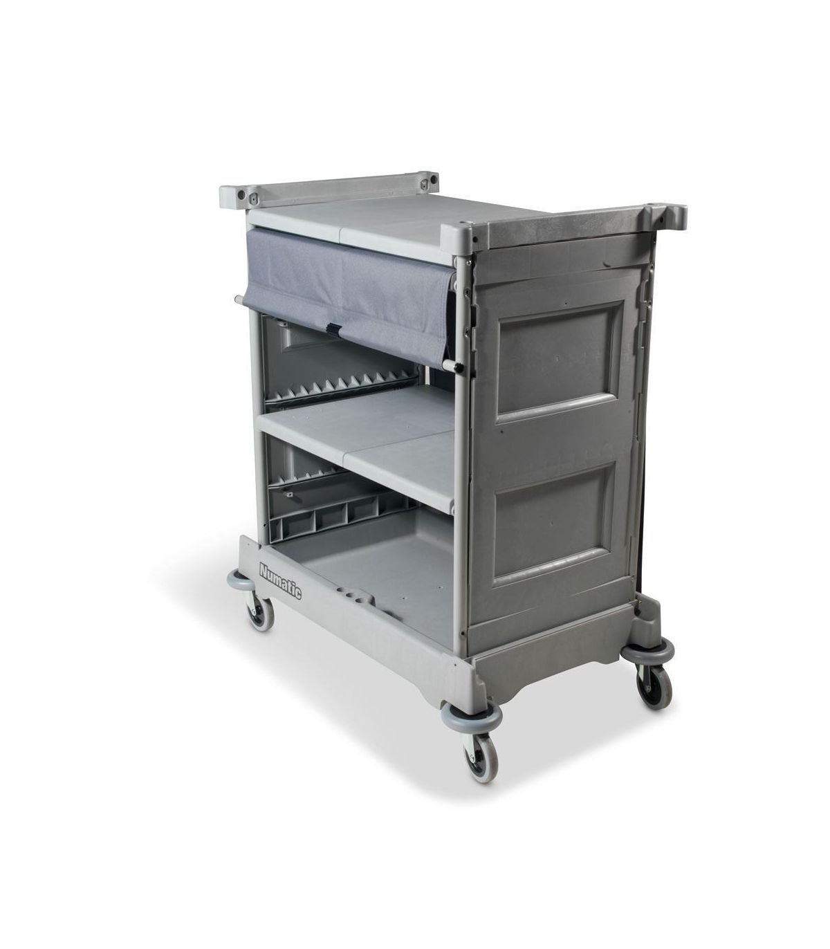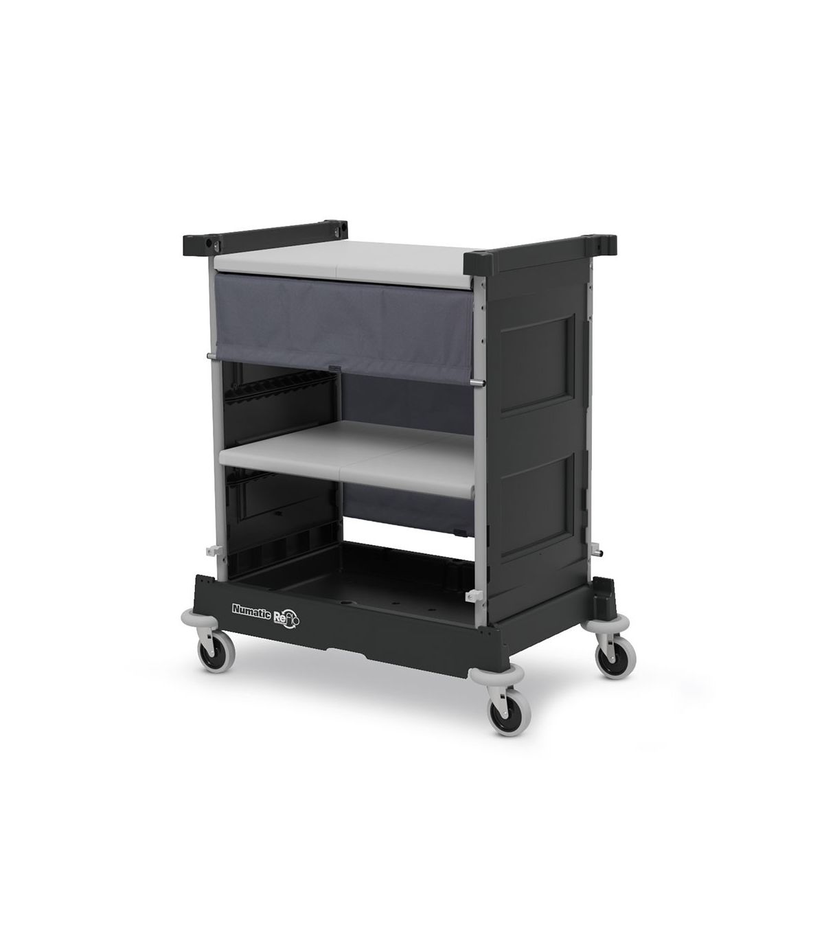 NKT 0 LLR NuKeeper angielskiej marki Numatic to średniej wielkości wielofunkcyjny wózek hotelowy przeznaczony do przewożenia bielizny hotelowej oraz wszelkiego wyposażenia hotelowego. Model z serii NKT wyposażony został w dwie wewnętrzne, poszerzone półki zasuwane roletą oraz jedną górną zewnętrzną.