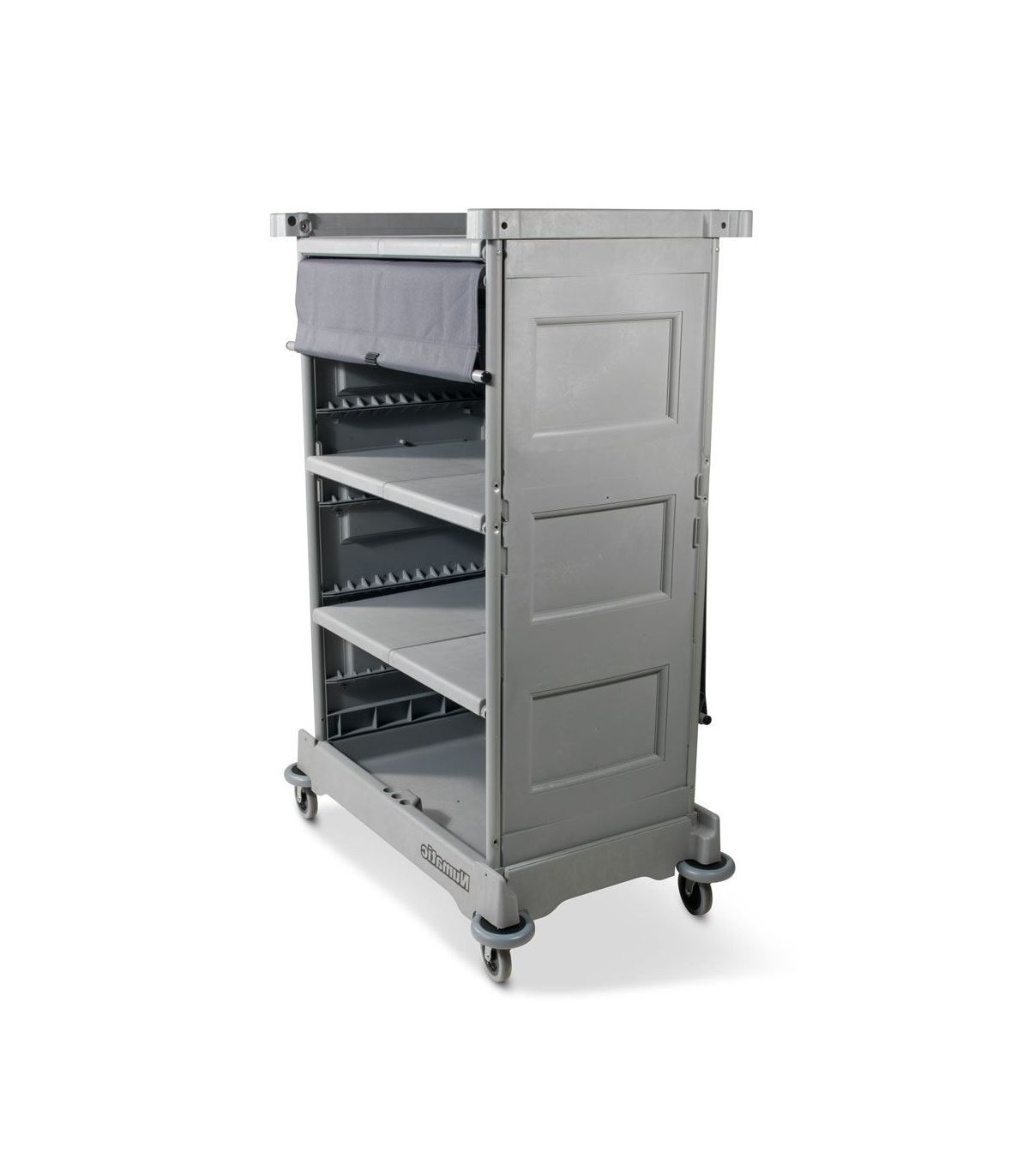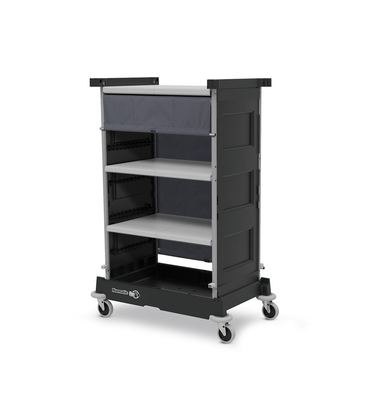 NKT 0 R angielskiej marki Numatic to wielofunkcyjny wózek przeznaczony do przewożenia bielizny i wszelkiego wyposażenia hotelowego. Wyposażony w trzy szerokie wewnętrzne półki zasuwane roletą oraz jedną zewnętrzną.