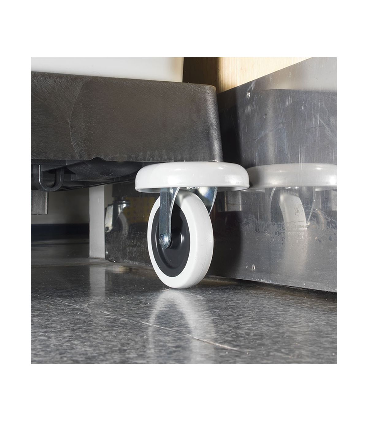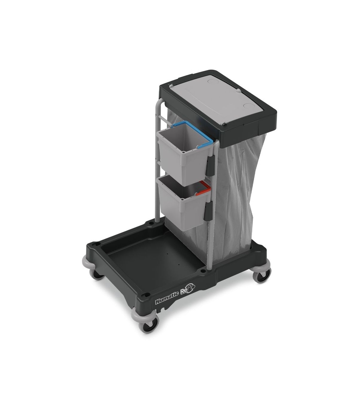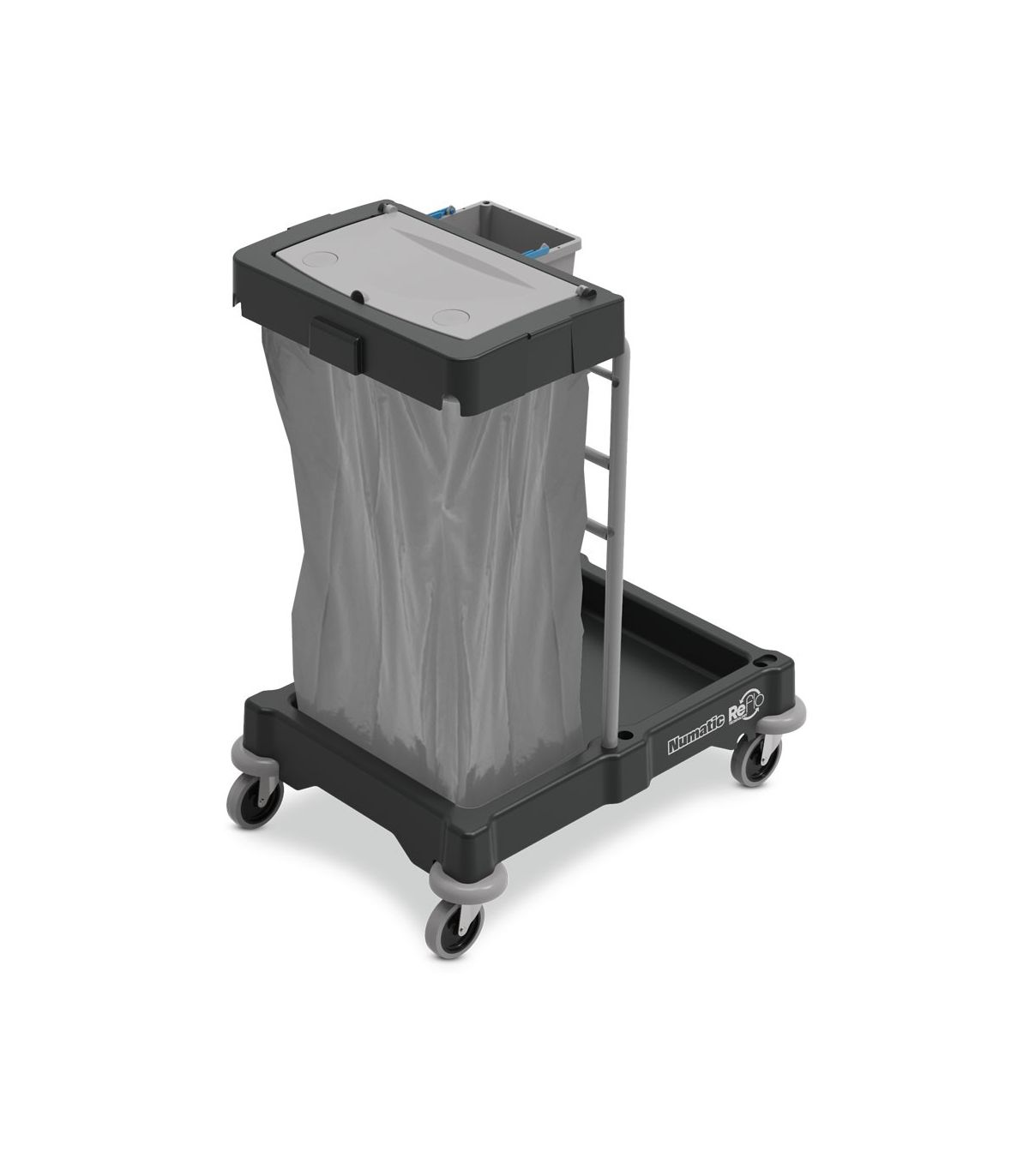 Model SM 1405 w wersji SRK 1 został wyposażony w dwa duże wiadra na brudną i czystą wodę, dwie mniejsze, uchylne kuwety do przechowywania dodatkowego sprzętu czy środków czystości oraz duży stelaż z klapą na jeden 120 litrowy lub dwa mniejsze 70-litrowe worki na odpady. Całość zestawu dopełnia duża, niezniszczalna i niezawodna wyciskarka uniwersalna Numatic umożliwiająca wygodne i dokładne odciśnięcie każdego rodzaju mopa czy ściereczek. Podstawa wózka została wykonana z odpornego na obicia, korozję i pęknięcia tworzywa Structofoam oraz malowany proszkowo stelaż. Całość konstrukcji dzięki zastosowaniu grafitowych kolorów popularnych w branży hotelarskiej, nie rzuca się w oczy i pozwala w łatwy sposób utrzymywać wózek w czystości.