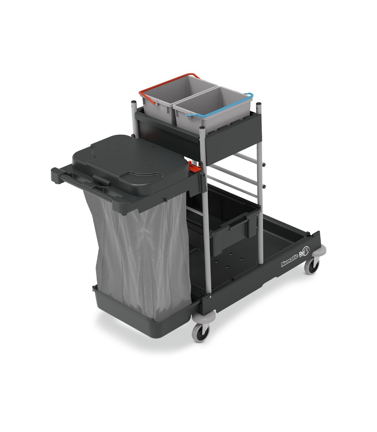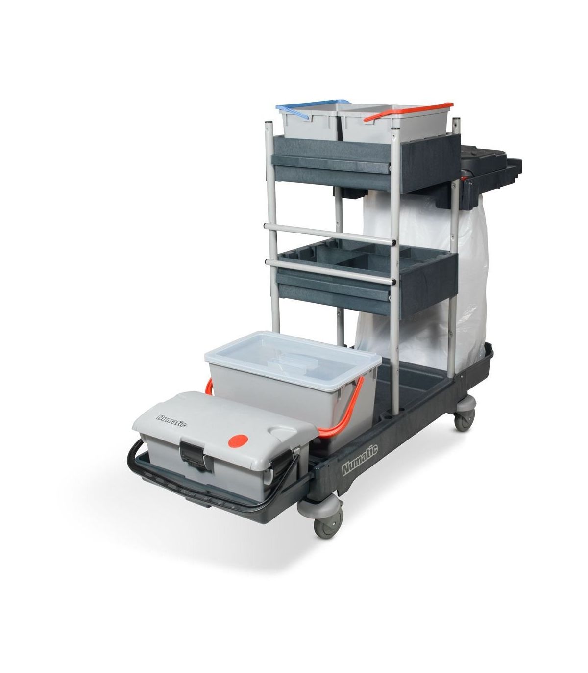 Serie wózków serwisowych ServoClean 1705 cechuje ponadprzeciętna jakość wykonania, uniwersalność oraz niezawodność. Konstrukcja wózka została wykonana z tworzywa Structofoam, odpornego na zarysowania oraz pęknięcia. Malowany proszkowo metalowy stelaż odporny na korozję zapewni estetyczny wygląd wózka na długie lata. Wózek został zaprojektowany z myślą o systemie mopa jednego kontaktu używanego między innymi w szpitalach oraz placówkach służby zdrowia. Doposażony w szczelny zestaw do impregnacji i przechowywania mopów dezynfekcyjnych. Uchwyt na worek w zależności od preferencji może być zamontowany w systemie 1x 120L lub 2x70L. Solidną konstrukcję uzupełniają kuwety oraz półki, w których w wygodny sposób można przewozić środki czystości oraz wszelkiego rodzaju sprzęt ręczny. Całość konstrukcji dzięki zastosowaniu grafitowych kolorów popularnych w branży hotelarskiej, nie rzuca się w oczy i pozwala w łatwy sposób utrzymywać wózek w czystości.